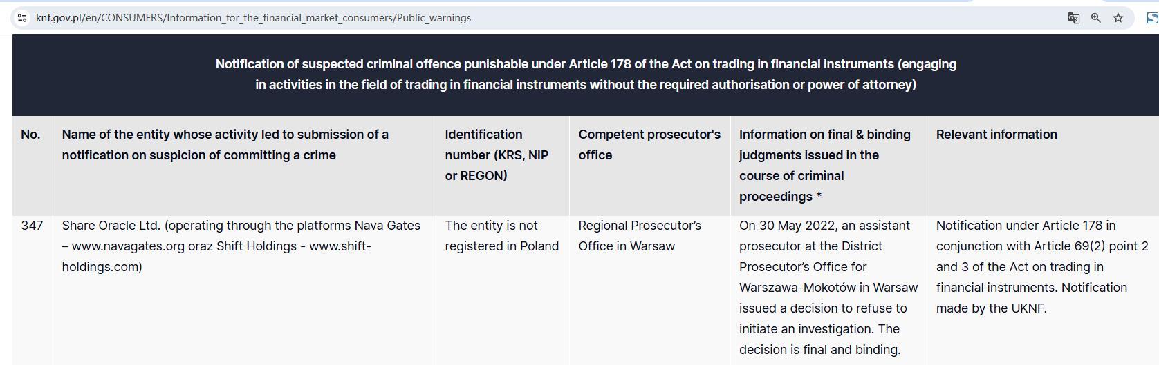 Share Oracle Ltd.(Betrieb über die Plattformen Nava Gates – www.navagates.org oraz Shift Holdings - www.shift-holdings.com) Das Unternehmen ist in Polen nicht bei der Regionalstaatsanwaltschaft Warschau registriert. Am 30. Mai 2022 erließ ein stellvertretender Staatsanwalt der Bezirksstaatsanwaltschaft Warszawa-Mokotów in Warschau eine Entscheidung, mit der die Einleitung eines Ermittlungsverfahrens abgelehnt wurde. Die Entscheidung ist endgültig und bindend. Mitteilung gemäß Artikel 178 in Verbindung mit Artikel 69 Absatz 2 Nummern 2 und 3 des Gesetzes über den Handel mit Finanzinstrumenten. Mitteilung erfolgte durch die UKNF. .