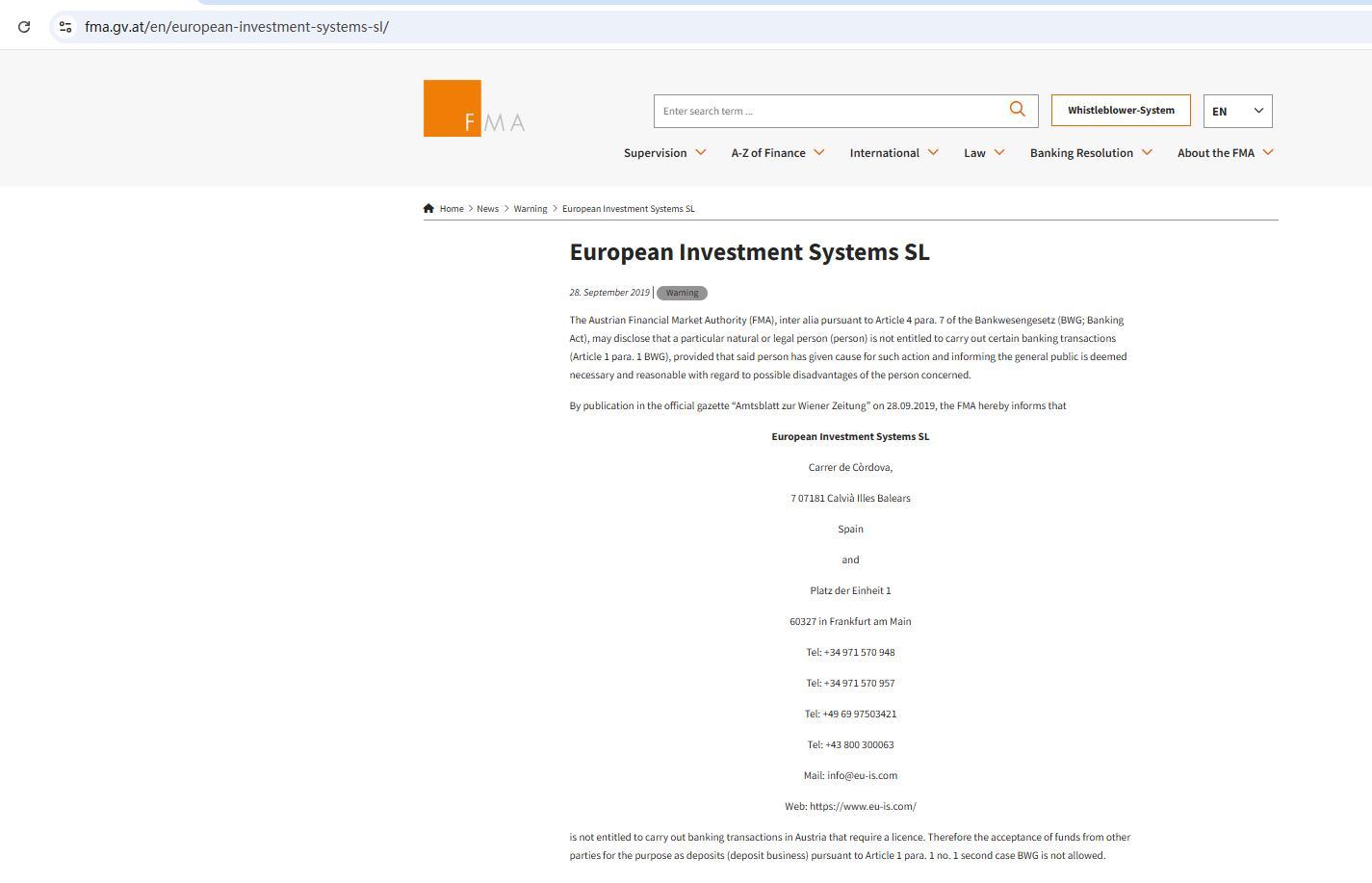 European Investment Systems SL Veröffentlichungsdatum: 28. September 2019 | Kategorien: Warnung Die österreichische Finanzmarktaufsicht (FMA) kann unter anderem gemäß § 4 Abs. 7 Bankwesengesetz (BWG) bekannt geben, dass eine bestimmte natürliche oder juristische Person (Person) zur Vornahme bestimmter Bankgeschäfte (§ 1 Abs. 1 BWG) nicht berechtigt ist, sofern diese Person hierzu Anlass gegeben hat und die Unterrichtung der Öffentlichkeit notwendig und im Hinblick auf mögliche Nachteile der betroffenen Person angemessen ist. Mit Veröffentlichung im Amtsblatt zur Wiener Zeitung vom 28.09.2019 informiert die FMA, dass die European Investment Systems SL Carrer de Còrdova, 7 07181 Calvià Illes Balears Spanien und Platz der Einheit 1 60327 in Frankfurt am Main Tel: +34 971 570 948 Tel: +34 971 570 957 Tel: +49 69 97503421 Tel: +43 800 300063 Mail: info@eu-is.com Web: https://www.eu-is.com/ nicht berechtigt ist, in Österreich konzessionspflichtige Bankgeschäfte zu betreiben. Daher ist ihr die Entgegennahme von Geldern Dritter zum Zwecke der Einlage (Einlagengeschäft) gemäß § 1 Abs. 1 Z 1 zweiter Fall BWG nicht gestattet.