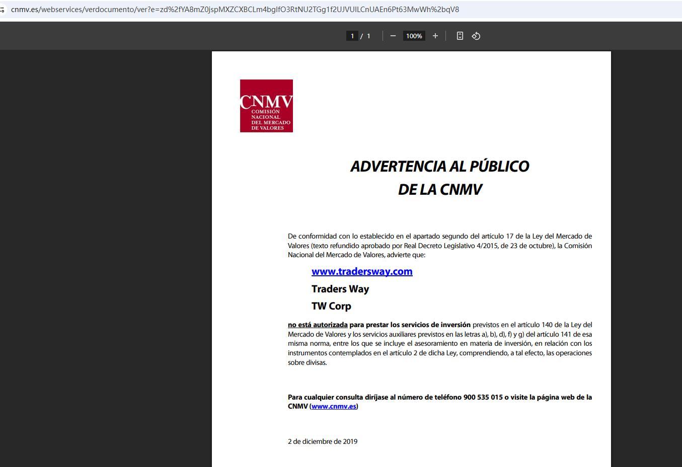 Öffentliche Bekanntmachung der CNMV gemäß den Bestimmungen des zweiten Abschnitts von Artikel 17 des Wertpapiermarktgesetzes (konsolidierter Text genehmigt durch das Königliche Gesetzesdekret 4/2015 vom 23. Oktober) warnt die Nationale Wertpapiermarktkommission, dass: www.tradersway.com traders way TW Corp Es ist nicht befugt, die in Artikel 140 des Wertpapiermarktgesetzes vorgesehenen Anlagedienstleistungen und die in den Buchstaben a), b), d), f) und g) des Artikels 141 desselben Gesetzes vorgesehenen Nebendienstleistungen, zu denen auch die Anlageberatung in Bezug auf die in Artikel 2 des genannten Gesetzes genannten Instrumente gehört, zu erbringen, wozu auch Devisentransaktionen gehören. Bei Fragen rufen Sie bitte 900 535 015 an oder besuchen Sie die CNMV-Website (www.cnmv.es) 2. Dezember 2019