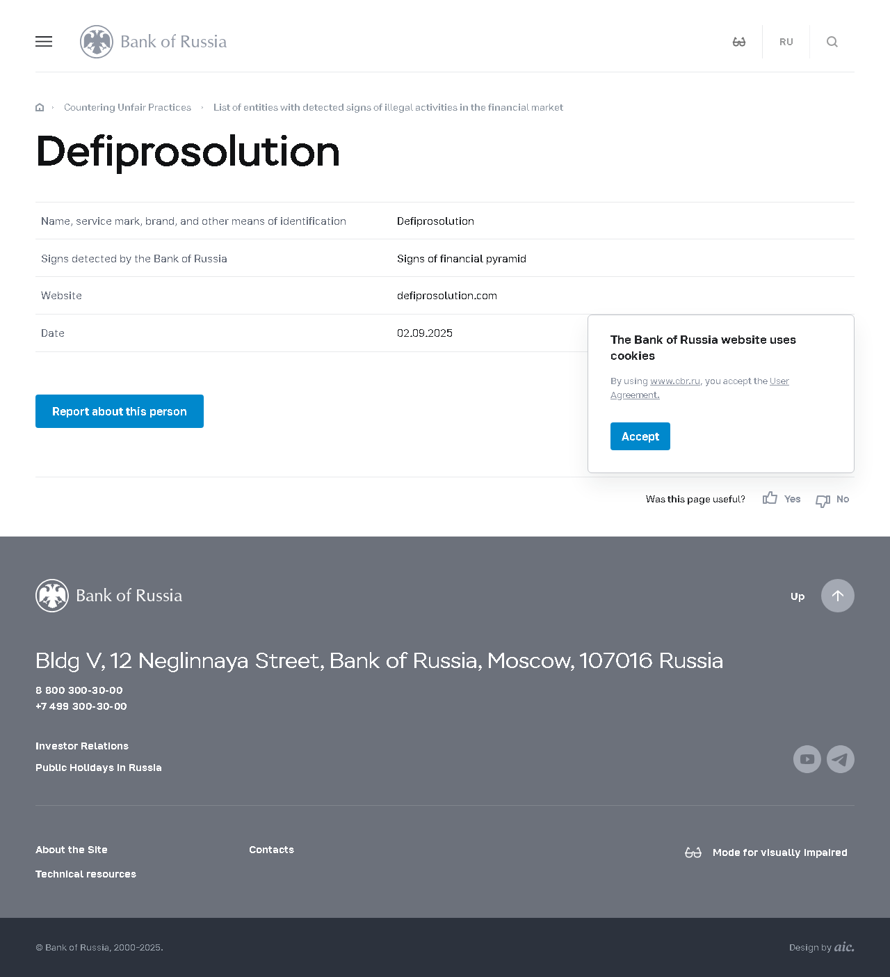 Name, Dienstleistungsmarke, Marke und andere Identifikationsmittel Defiprosolution Von der Bank Russlands erkannte Anzeichen Anzeichen einer Finanzpyramide Webseite defiprosolution.com Datum 02.09.2025.