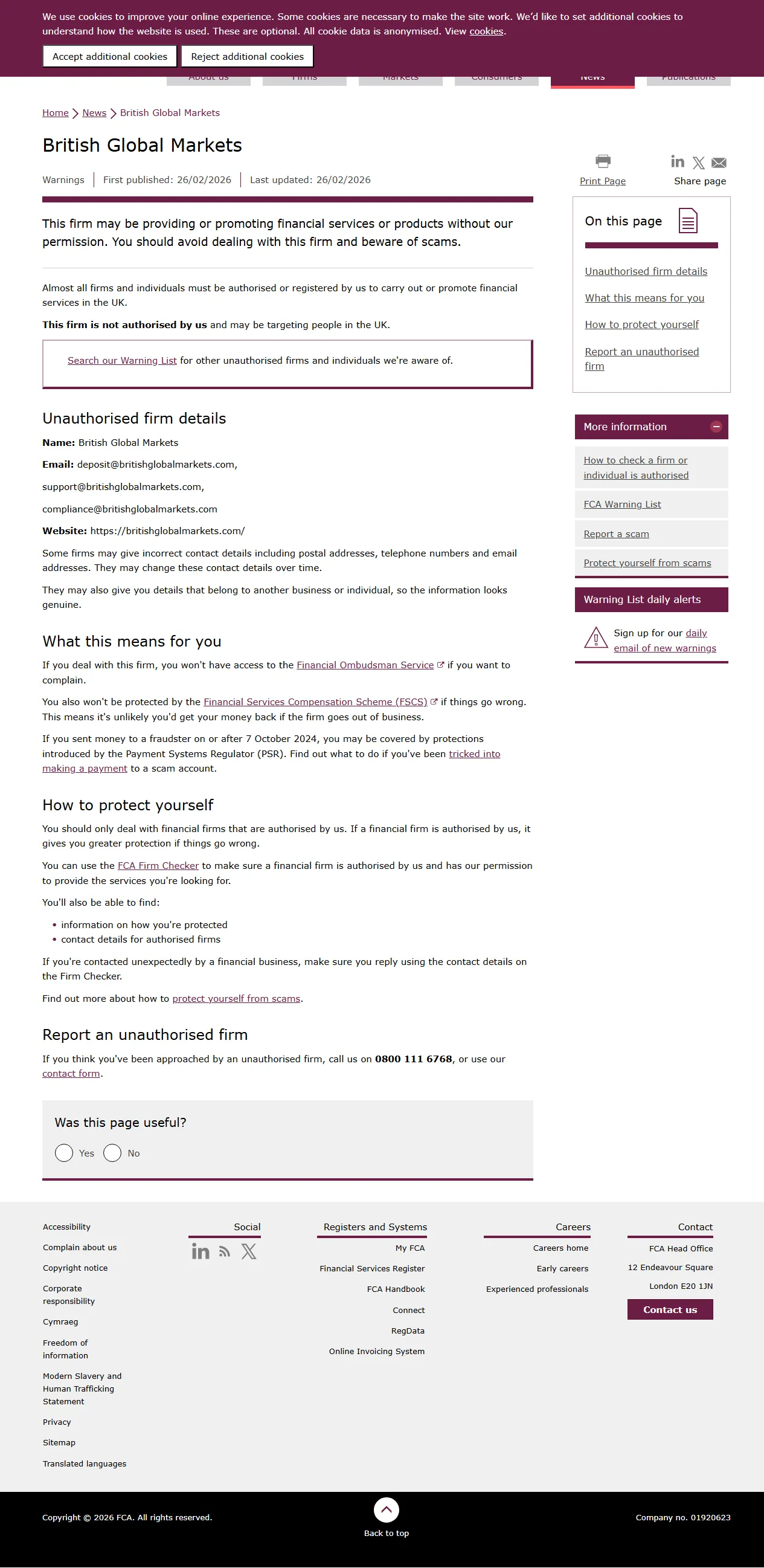 FCA-Warnliste nicht autorisierter Unternehmen British Global Markets.