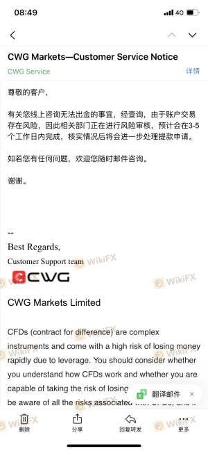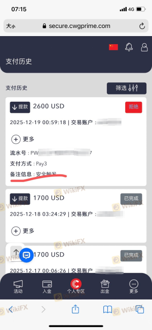 CWG黑平台 刚玩这个平台才五天时间 账户本金+盈利3270USD 现在拒绝出金 理由是帐户交易存在风险 怎么个存在风险了 平台说什么就是什么嘛?盈利就有风险?那亏损呢?为什么就没有风险了 平台吃相未免太过难看了。