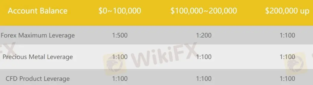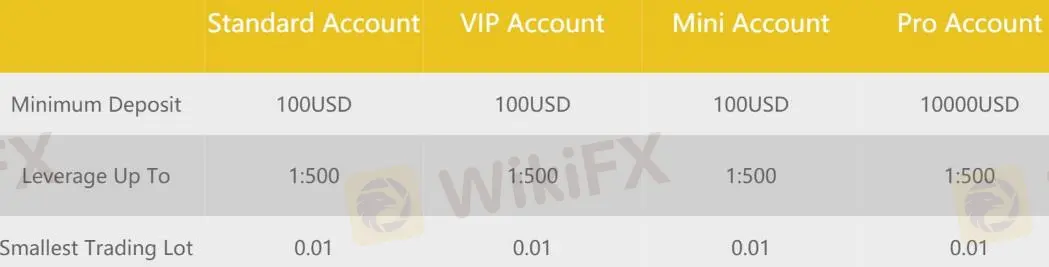 Das Pro-Konto hat die höchste Mindesteinzahlungsanforderung von 10.000 $. Die anderen drei Konten betragen jeweils 100 $. Darüber hinaus beträgt der Hebel einheitlich 1:500.