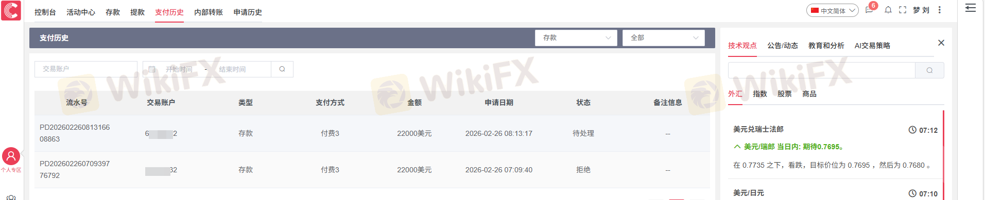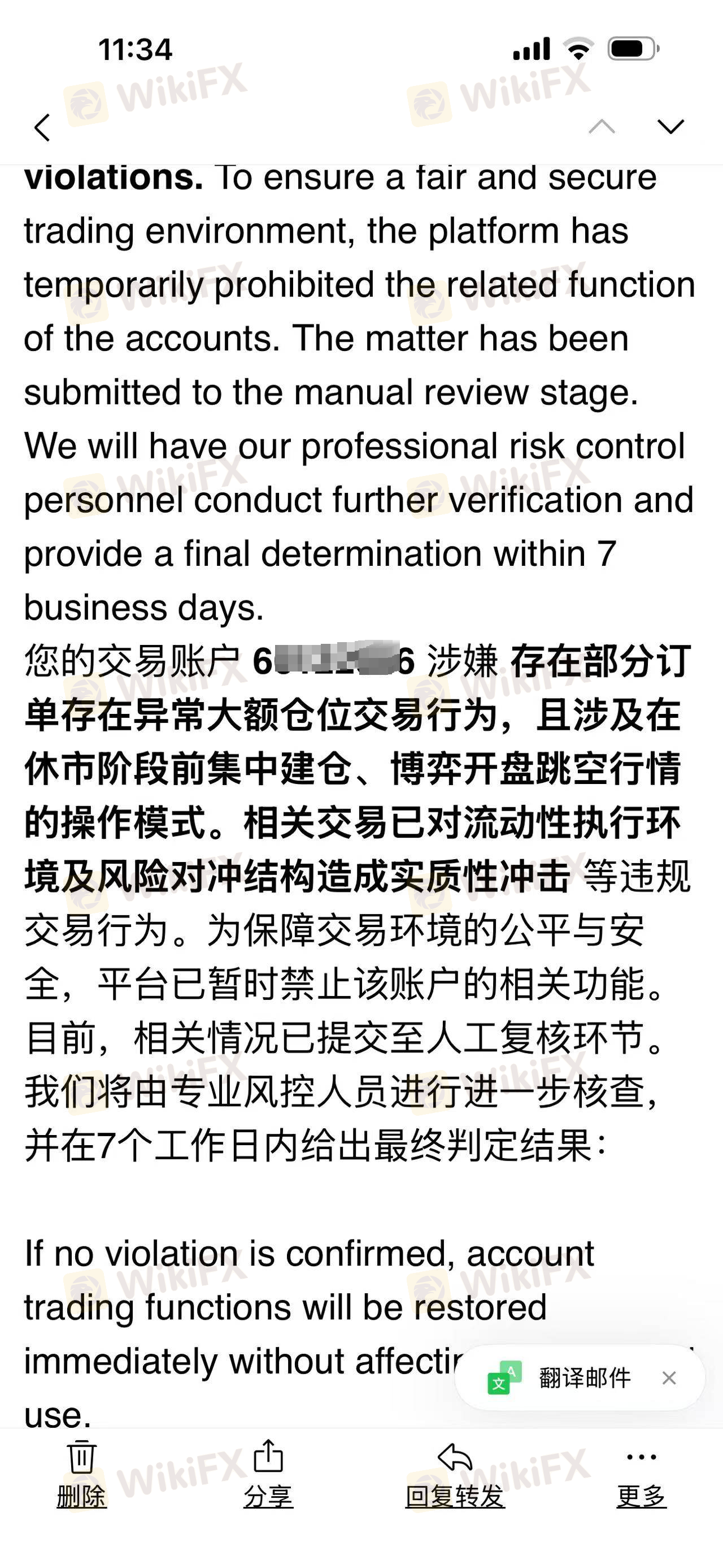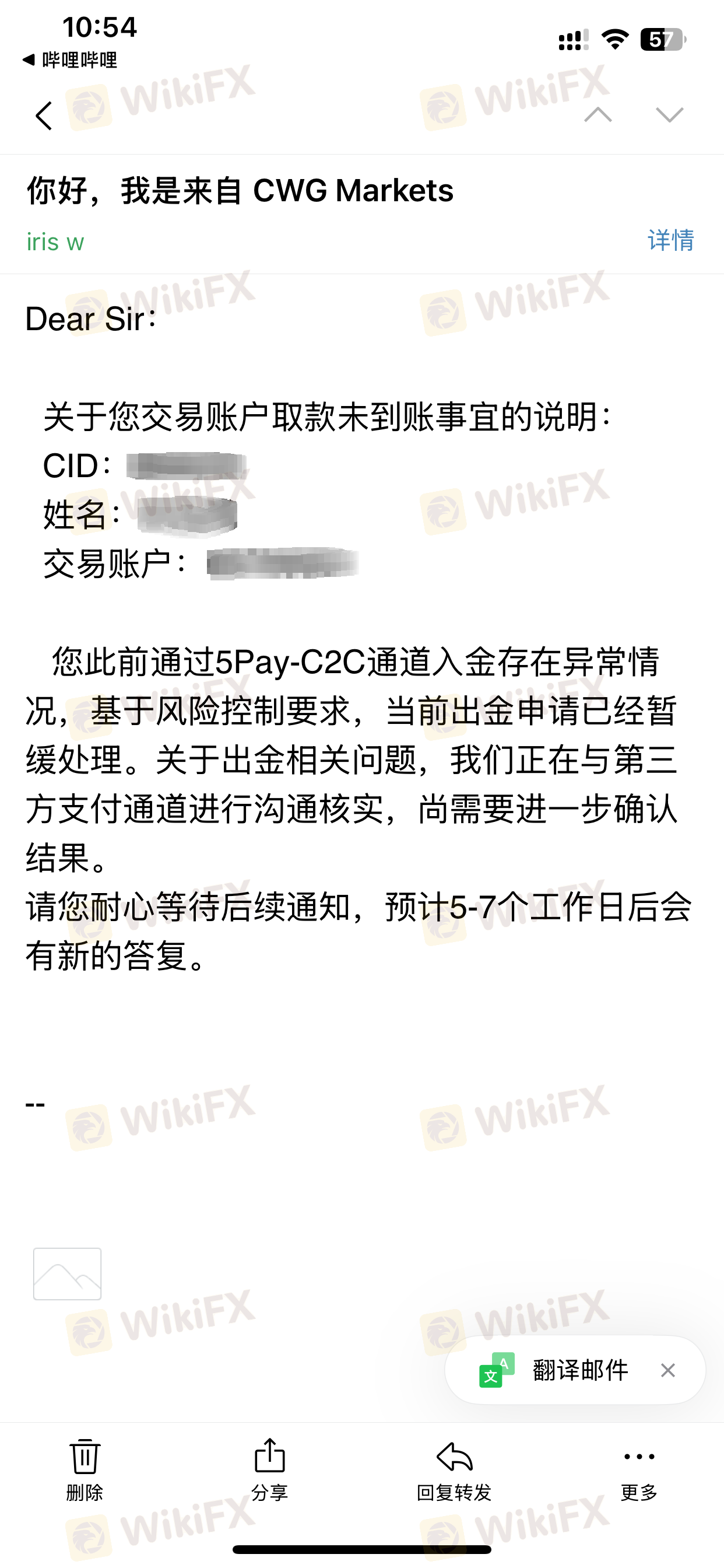 Nachdem ich am 21.06. 100.000 US-Dollar eingezahlt hatte, begann ich mit dem Handel. Es gab keine Probleme bei der Auszahlung von Gewinnen, bis ich am 31.07. einen Auszahlungsantrag stellte. Als ich die entsprechenden Mitarbeiter anrief, machten sie ständig Ausreden. Erst am 23.09. sandte die Handelsabteilung von CWG einen Brief, in dem stand, dass ich ohne jeglichen Beweis "unregelmäßigen Handel" betrieben hätte, und sie entfernten unangemessen den Betrag von 34.579,43 US-Dollar von meinem MT4-Konto. Ich handle schon lange mit Forex-Margin, und dies ist das erste Mal, dass ich auf eine Plattform gestoßen bin, die Ihre Gelder nur mit einer "unregelmäßigen Handels"-Anschuldigung wegnehmen kann. Da es 8 Wochen dauert, bis das Vereinigte Königreich meinen Beschwerdebrief bearbeitet, möchte ich die Kunden von CWG hier daran erinnern, mit dieser Plattform äußerst vorsichtig zu sein. Seien Sie äußerst vorsichtig. PS: Die von mir bereitgestellten Fotos sind Screenshots aus meinem eigenen Backend. Ich habe meinen Namen und meine Informationen verwischt, um Vergeltungsmaßnahmen von der Plattform zu vermeiden, und habe alle meine anderen Informationen gelöscht.