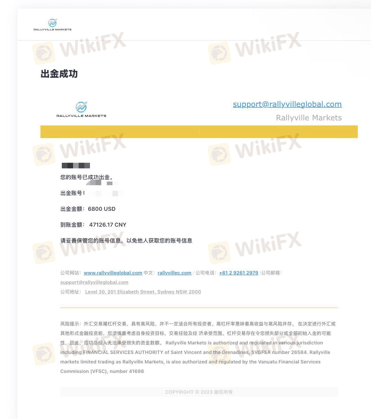 RALLYVILLE MARKETS LIMITED wird offshore von VFSC reguliert und besitzt eine Einzelhandels-Forex-Lizenz mit der Lizenznummer 41698.