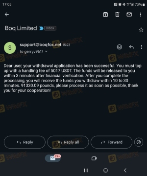 Ich habe eine Abhebung von 112.775 USD vorgenommen und sie wird derzeit überprüft. Ich kontaktiere den Kundendienst und er teilt mir mit, dass der Betrag, den ich abgehoben habe, aufgrund einer Anomalie auf dem ID-Konto nicht freigegeben werden kann und auf den letzten Betrag von 3.035 USDT aufgeladen werden muss, der über OKX über Händler eingezahlt wird. Sie erklärten mir das Problem und ermutigten mich, die Aufladegebühr zu zahlen. Nach einer Weile schickte mir der Kundendienst eine Nachricht, dass sie zur Freigabe bereit seien, einschließlich der zu hohen Zahlung. Da ich jedoch damit einverstanden bin, das Geld freizugeben, muss ich den Betrag von 5.017 USD als Bearbeitungsgebühr aus eigener Tasche bezahlen. Nach Erhalt der Zahlung wird das Geld innerhalb von 10 bis 30 Minuten freigegeben. Ich habe nicht bezahlt, weil mir klar wurde, dass ich bereits betrogen wurde. Das letzte Bild unten ist von ihnen BOQ Forex-Plattform und die zweite ist die Anmeldung. Dies unterscheidet sich von echt BOQ Plattform, die wie auf dem letzten Foto gelb gefärbt ist