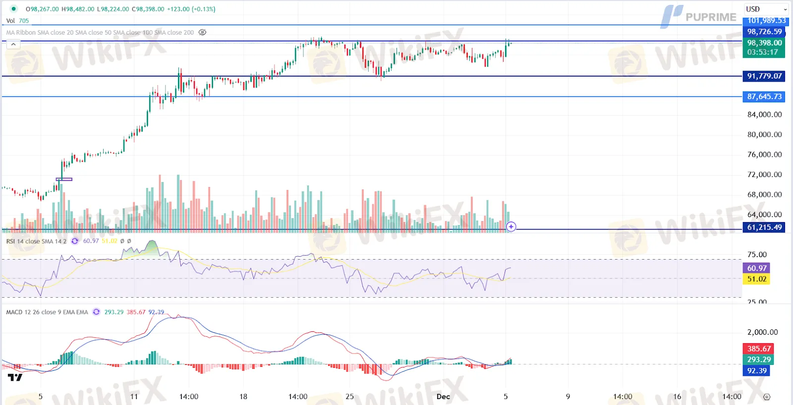 BTC is trading higher while currently testing the resistance level. MACD has illustrated increasing bullish momentum, while RSI is at 62, suggesting the crypto might extend its gains after breakout since the RSI stays above the midline.