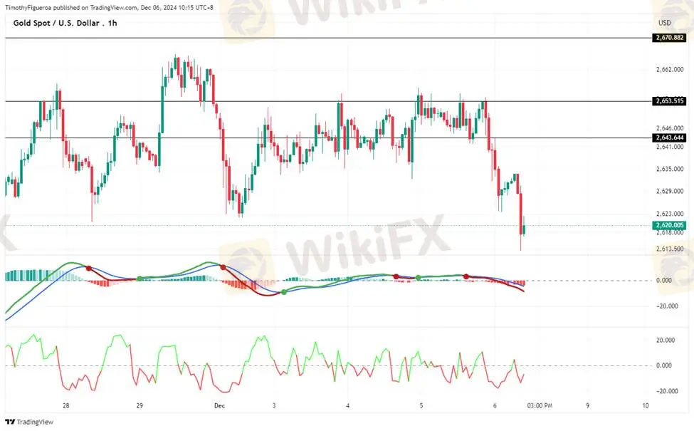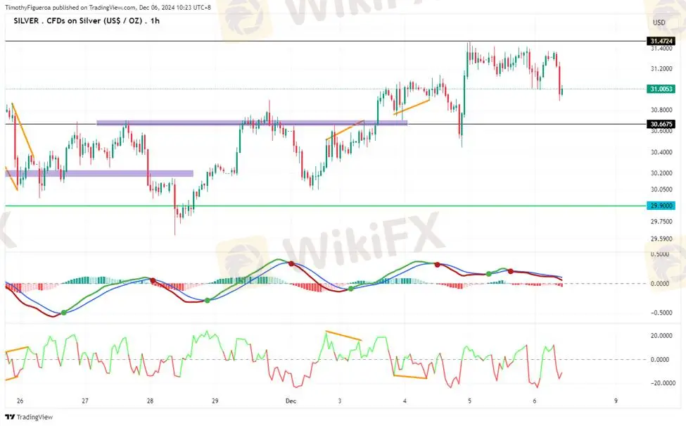 Silver prices are currently under selling pressure after reaching 31.4724, aligning with expectations of more consolidated trading. The MACD indicates increased selling momentum, and the RSI reflects a similarly strong bearish sentiment. Further trading is needed to determine whether prices will continue to fall and maintain the consolidated range.
