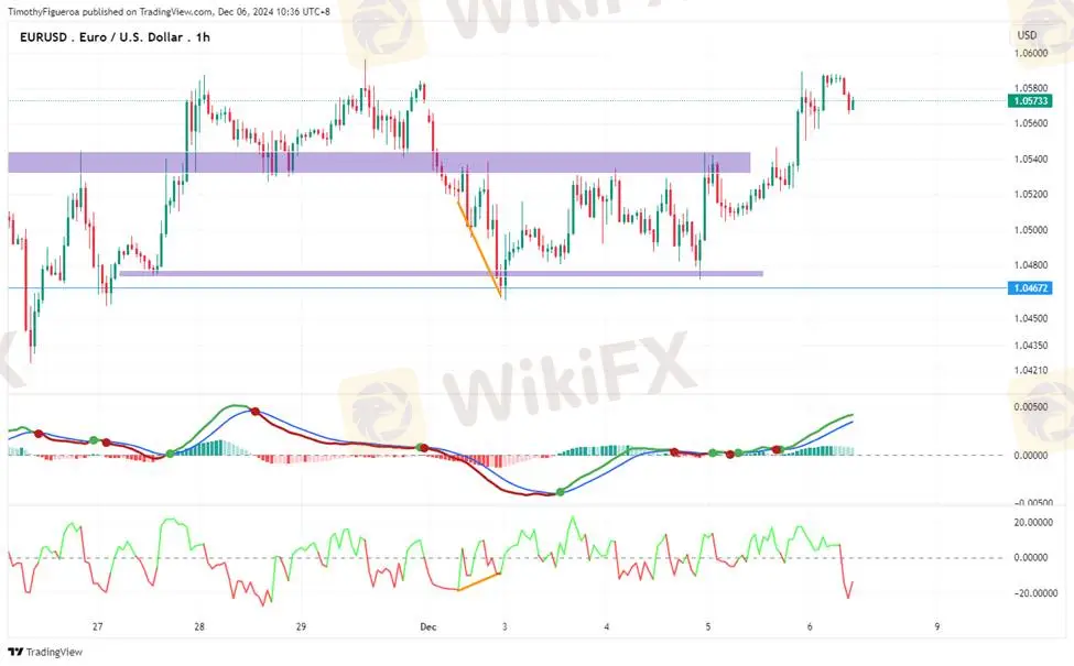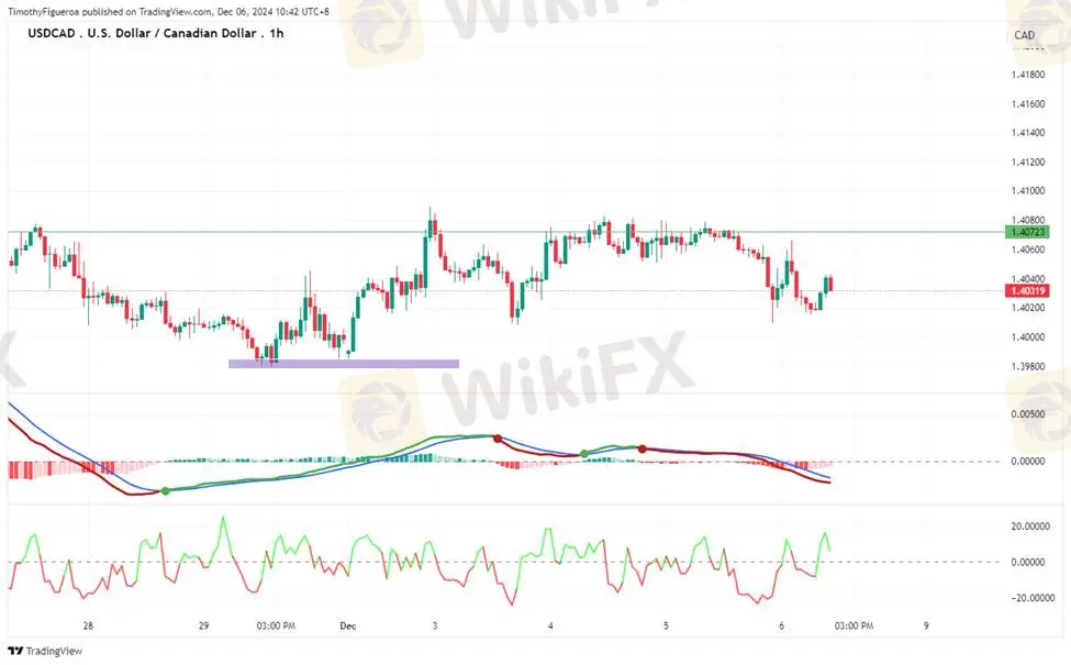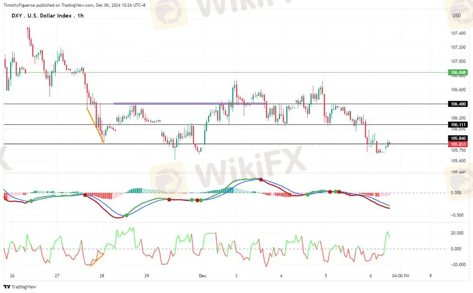 The Dollar weakened following yesterday's market activity, with analysts now awaiting employment data later today to refine their expectations for the coming week. The RSI shows a sudden burst of buying strength despite slow price movement, signaling a deceleration in bullish momentum and increased selling pressure. The MACD corroborates this with strong selling momentum. We anticipate further dollar weakness, driven by heightened expectations of a rate cut. However, the unemployment report released yesterday dampened market confidence, reducing the probability of a December rate cut from 73% to 70%.