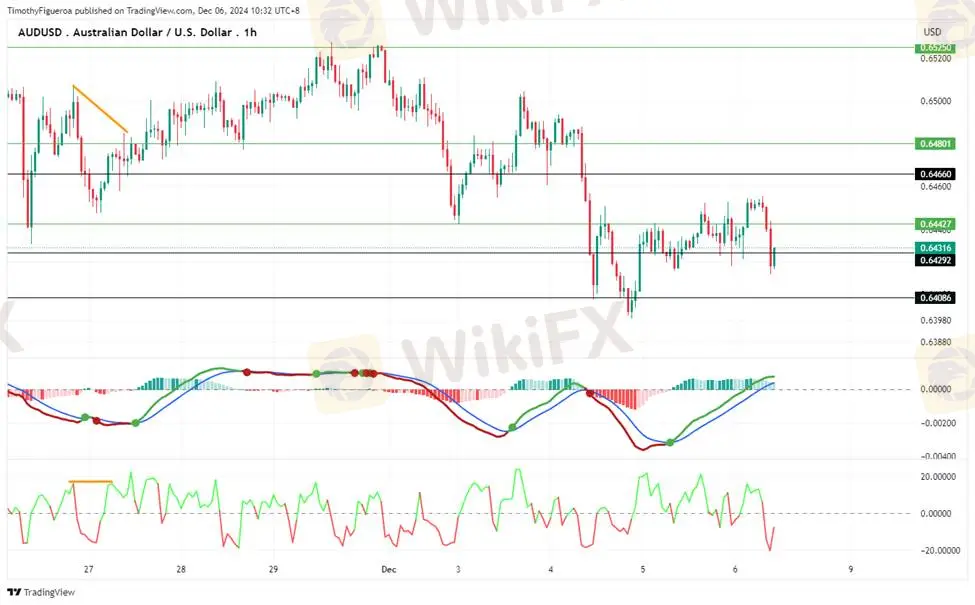 The Aussie Dollar remains in a consolidative phase, having regained slightly before retreating below 0.64427. The RSI shows minor hesitation toward selling, having reached oversold conditions during a previous downturn. Meanwhile, the MACD indicates buying strength. Despite these signals, both indicators suggest a bearish market bias. Further selling continuation is anticipated.