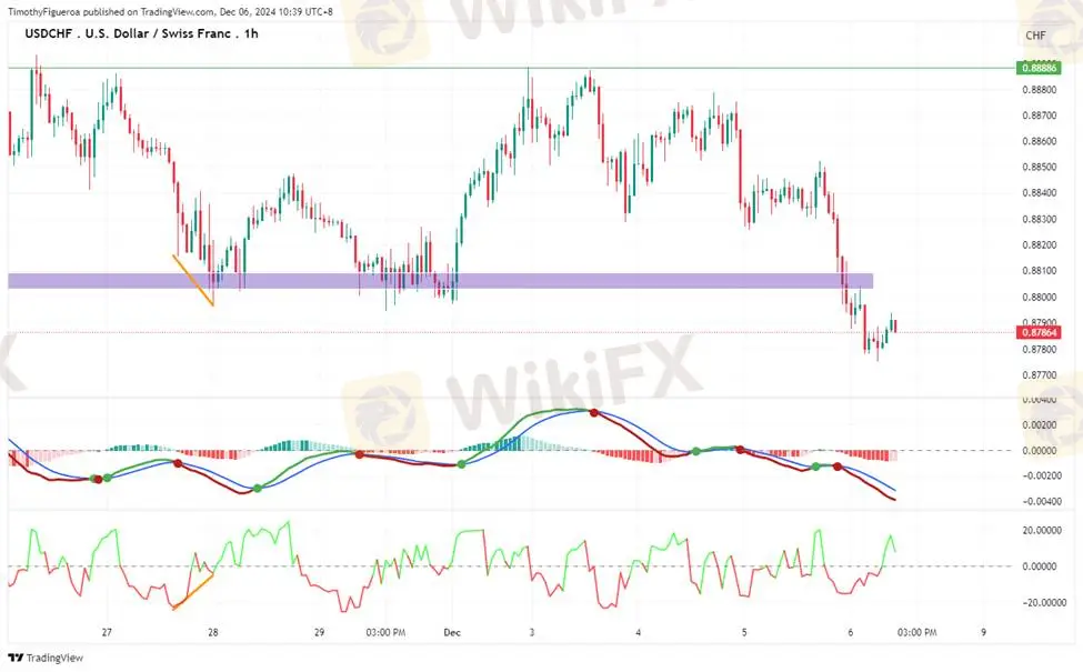 The Franc gained strength as the Dollar weakened, with both the MACD and RSI supporting this market expectation. Increased volume and momentum have pushed prices lower, breaking through previous swing lows after failing to breach resistance at 0.88886. The bearish trend remains intact.