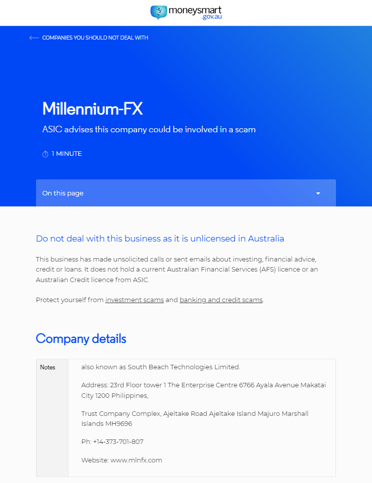 millennium-fx asic weist darauf hin, dass dieses Unternehmen in eine Betrugsseite verwickelt sein könnte. Lesezeit: 1 Minute auf dieser Seite. Befassen Sie sich nicht mit diesem Unternehmen, da es in Australien nicht lizenziert ist. Dieses Unternehmen hat unerwünschte Anrufe getätigt oder E-Mails zu den Themen Investitionen, Finanzberatung und Kredit gesendet oder Kredite. Es verfügt nicht über eine aktuelle australische Finanzdienstleistungslizenz (AFS) oder eine australische Kreditlizenz von ASIC. Schützen Sie sich vor Anlagebetrug sowie Bank- und Kreditbetrug. Firmendetails, Notizen, auch bekannt als South beach technologies limited . Adresse: 23rd Floor Tower 1 The Enterprise Center 6766 Ayala Avenue Makatai City 1200 Philippines, Trust Company Complex, Ajeltake Road Ajeltake Island Majuro Marshall Islands MH9696 Tel.: +14-373-701-807 Website: www.mlnfx.com