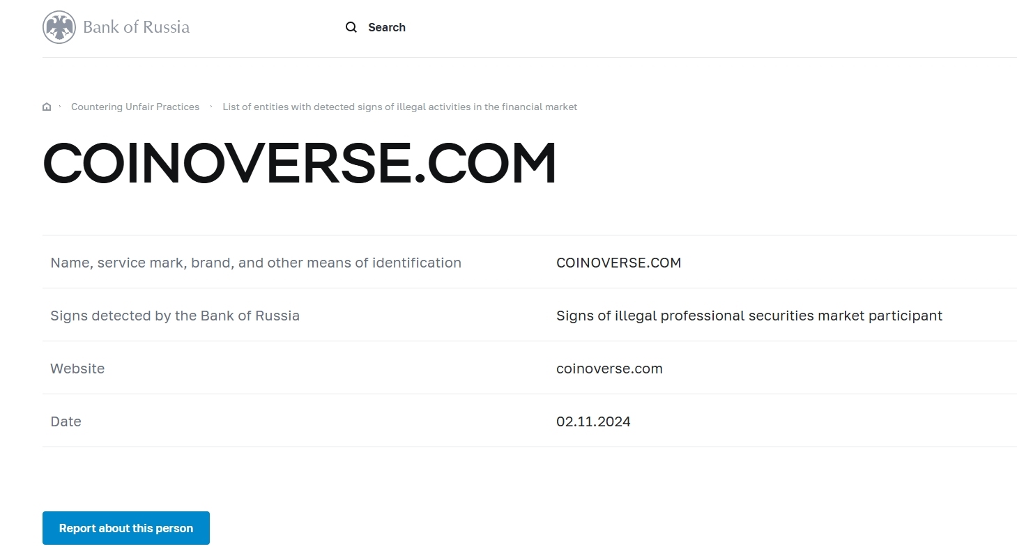 Name, Dienstleistungsmarke, Marke und andere Identifikationsmittel Coinoverse .com-Zeichen, die von der Bank von Russland entdeckt wurden Zeichen einer illegalen Website eines professionellen Wertpapiermarktteilnehmers Coinoverse .com Datum 02.11.2024