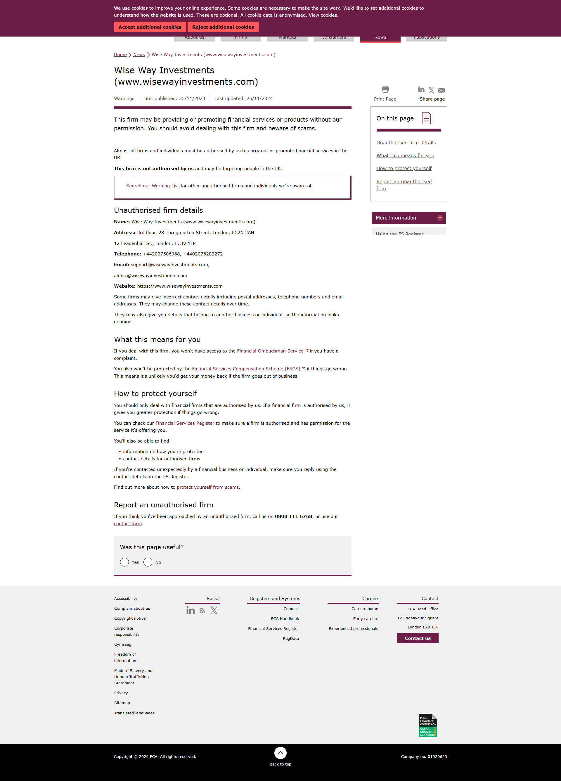 FCA-Warnliste nicht autorisierter Firmen Wise Way Investments (www.wisewayinvestments.com).