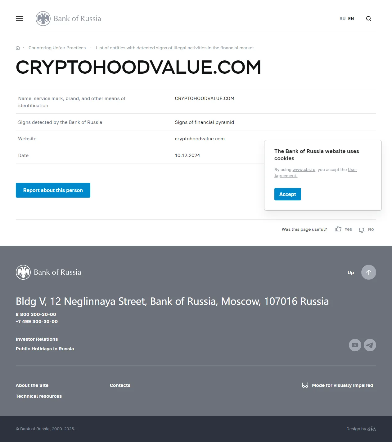 Name, Dienstleistungsmarken, Markenzeichen und andere Identifikationsmerkmale CRYPTOHOODVALUE.COM Von der Bank Russlands erkannte Merkmale Merkmale eines Finanzpyramidensystems Website cryptohoodvalue.com Datum 10.12.2024.