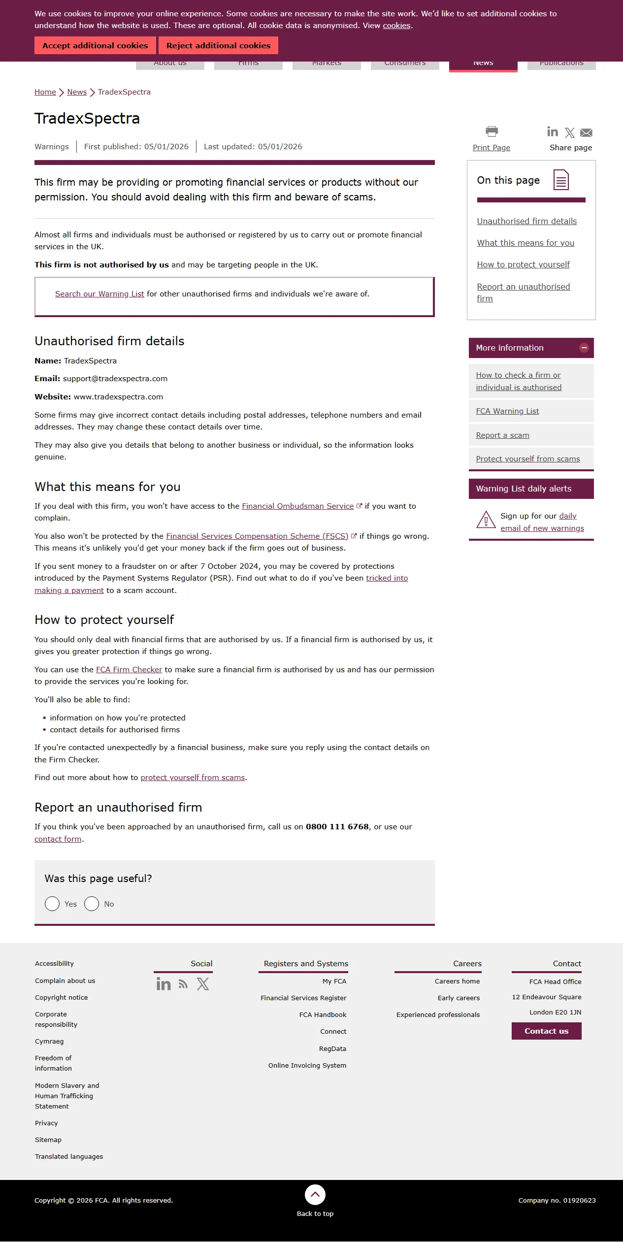 FCA-Warnliste nicht autorisierter Firmen TradexSpectra.