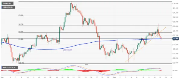 Silver extends pullback from two-week low, justifies weekly support break. Bearish MACD hints at further downside but bears need validation from $23.00. Buyers must cross 38.2% Fibonacci retracement to retake control.