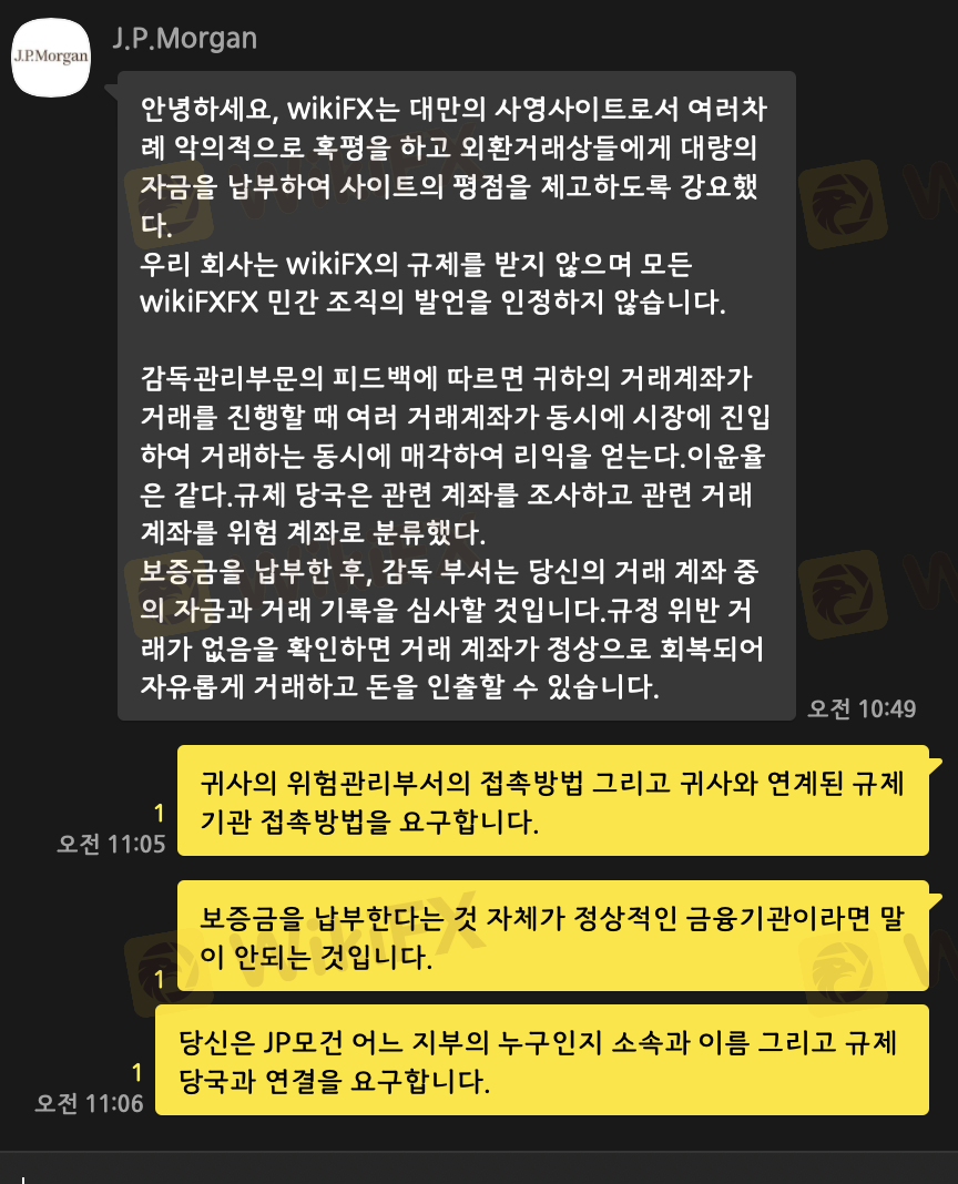전날 DEUS 로맨스 스탬 사기에 관한 내용을 보았습니다. 저는 카카오톡으로 대화를 진행했고, 사례와 동일한 방법으로 당한걸(미국의 삼촌 이야기) 인지해 J.P.Morgan 사이트를 통해 출금 요청중입니다. "시스템에서 귀하의 거래 계정이 여러 계정과 관련되어 있음을 감지했습니다. 내부자 거래 및 기타 불법 거래 행위로 인해 귀하의 거래 계정이 비정상적으로 되었습니다." 라는 이유로 출금을 거부하고 보증금을 지불하라 합니다. 22363.11 USD를 요구하는데, 저는 입금한 원금이라도 찾고 싶습니다. 추가로 WikiFX의 사례를 언급했는데 돌아오는 답변은 이렇습니다. "안녕하세요, wikiFX는 대만의 사영사이트로서 여러차례 악의적으로 혹평을 하고 외환거래상들에게 대량의 자금을 납부하여 사이트의 평점을 제고하도록 강요했다. 우리 회사는 wikiFX의 규제를 받지 않으며 모든 wikiFXFX 민간 조직의 발언을 인정하지 않습니다. 감독관리부문의 피드백에 따르면 귀하의 거래계좌가 거래를 진행할 때 여러 거래계좌가 동시에 시장에 진입하여 거래하는 동시에 매각하여 리익을 얻는다.이윤율은 같다.규제 당국은 관련 계좌를 조사하고 관련 거래 계좌를 위험 계좌로 분류했다. 보증금을 납부한 후, 감독 부서는 당신의 거래 계좌 중의 자금과 거래 기록을 심사할 것입니다.규정 위반 거래가 없음을 확인하면 거래 계좌가 정상으로 회복되어 자유롭게 거래하고 돈을 인출할 수 있습니다." 현재 출금이 진행되고 있지 않으며 모든 과정을 캡쳐했습니다. 사업 실패로 인한 채무를 갚기위해 모든 돈입니다. 이 금액을 잃으면 저는 살 길이 없습니다. 도와주십시요. 추가로 과정에 대한 기록과 자료 요청 시 응할 수 있습니다.