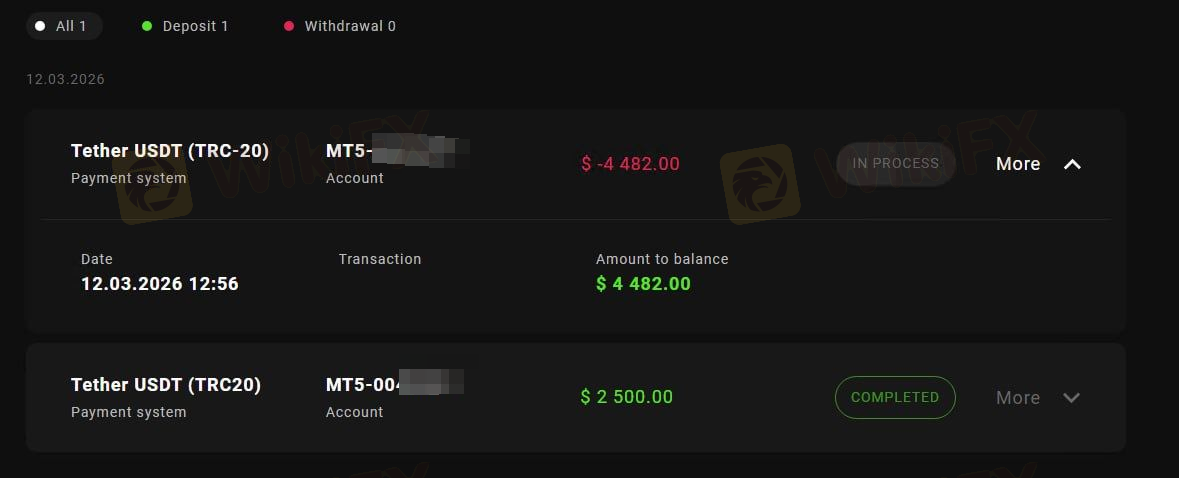 Vào ngày 12/03/2026, tôi đã gửi yêu cầu rút số tiền 4.482 USD thông qua USDT (TRC-20). Tuy nhiên, cho đến hiện tại, yêu cầu rút tiền của tôi vẫn đang ở trạng thái chờ xử lý và chưa được hoàn tất.