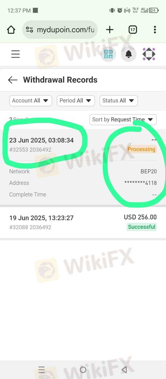 Facing withdrawal issues with DuPoin left me feeling extremely angry and helpless. These are funds I invested and worked hard to earn, yet when I tried to withdraw, they were delayed, stuck, and never given a clear explanation. It felt like being trapped—knowing the money is in my account but having no way to move it. What disappointed me the most is that deposits were smooth and easy, but withdrawals became the biggest obstacle. This made me seriously doubt the platform’s integrity and safety. To me, this is no longer just a technical issue—it feels like being deceived and betrayed.