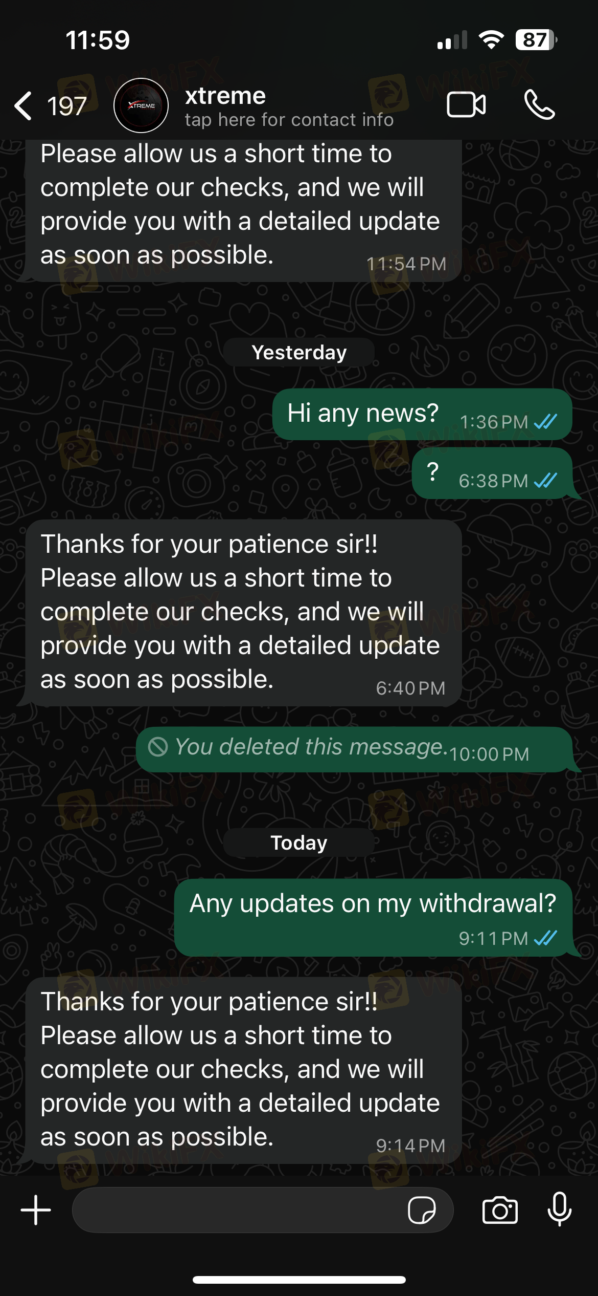 Caution: Xtream Forex Notification Exercise caution as the company is hesitant to disburse profits resulting from high-frequency trades amid unpredictable market fluctuations It appears that Xtream Forex may lean towards its clients incurring losses, while my account wqs incurring losses it was all hahaha nice for them. Their managers : 1: Amandeep 2: Priya 3: Hemma above mentioned three idiots refuse to discuss on subject and claims and speaking crptics and riddles. Aforementioned company is adamant I take my initial deposit amount of $5000.00 and walk away. please also note company The affected party is JB, with Xtream Forex account number 2109052339. Attached are 1 chats with Priya (In Urdu) 2: deposit via USDT to Xtremeforex 3: email communication seeking clarification from the company for the claims of my offense. 4: My trades