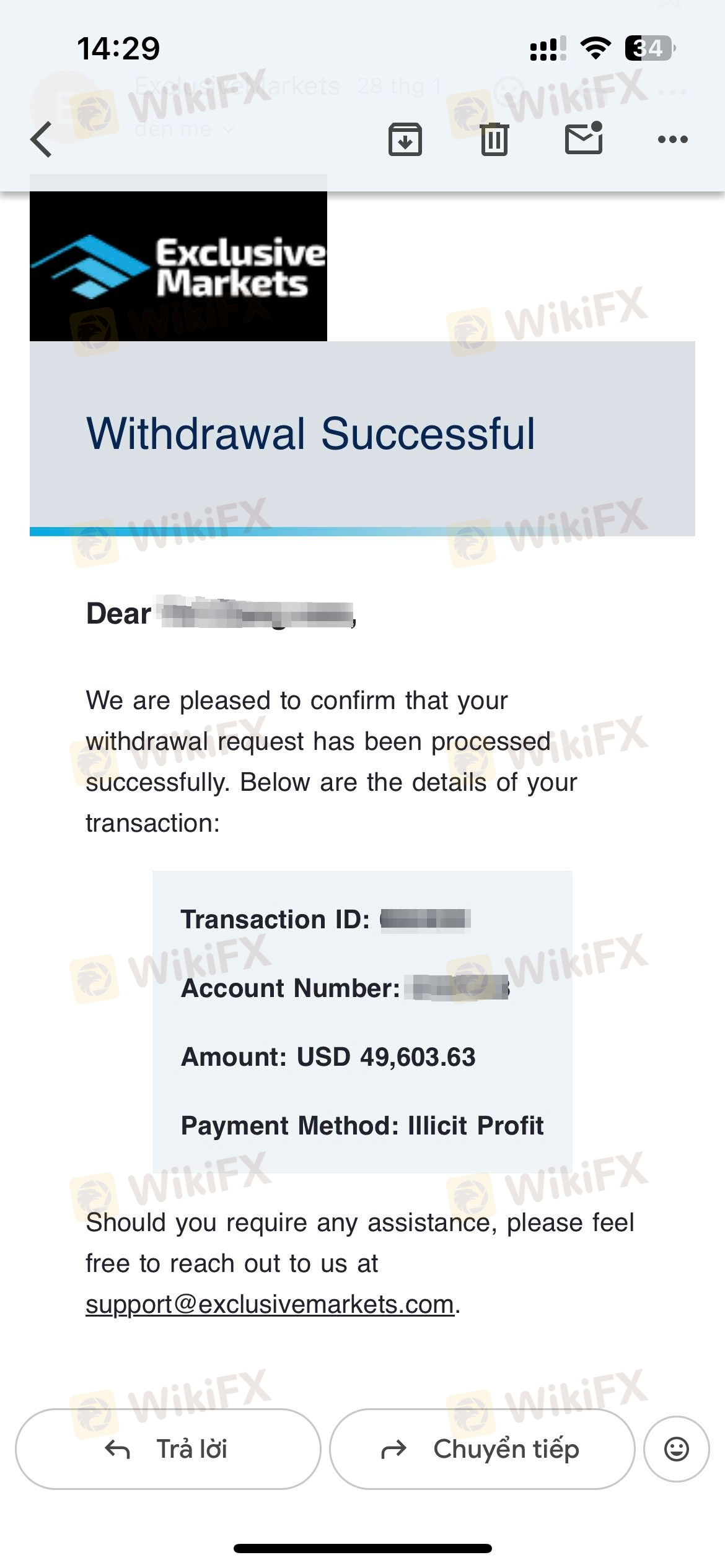 I am a client who opened a trading account with Exclusive Markets and have engaged in trading strictly in accordance with the terms and conditions published by the platform. My account was granted a leverage of 1:4000 under the platform's policy. During the course of trading XAUUSD, I adhered strictly to the leverage provided by the platform and executed orders based on market mechanisms. At a time of significant market volatility, I generated legitimate profits from my trades. After my total profits reached $50,037, I submitted a withdrawal request following the proper procedure. However, Exclusive Markets failed to process the payment. Not only that, my entire profit was reversed back into the platform's system, and they falsely accused me of violating liquidity rules. More seriously, my trading account has been locked, preventing me from logging in to retrieve transaction data, trading history, or necessary evidence to cooperate with regulatory authorities.