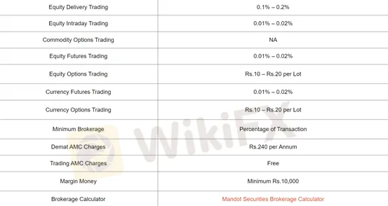 Mandot Securities charges a wide selection of fees. In particular, account opening charges Rs.299; the Demat account annual maintenance charge is Rs.240 annually; the charge for the equity delivery is 0.1%-0.2%; the charge for equity intraday, equity futures and currency futures is within 0.01% to 0.02%; other details can be seen in the below screenshots.