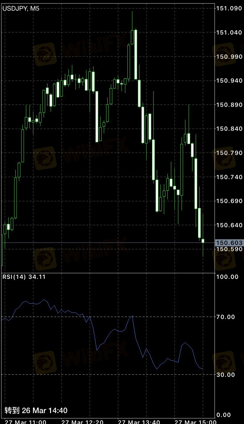 IndustryUSDJPY五分钟图呈现超卖信号,短期或存反弹契机