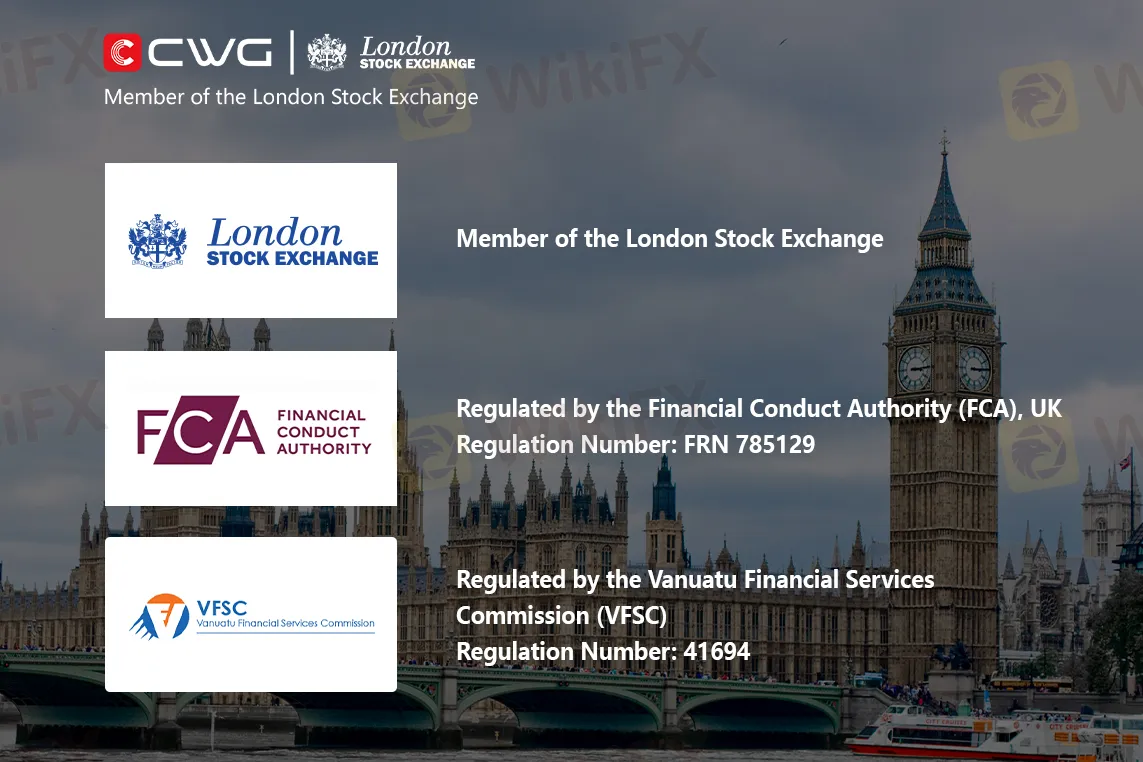 CWG Markets Ltd (UK) is a registered investment firm in England and Wales, with company number 08888720. It is fully authorised and regulated by The Financial Conduct Authority (FCA), under the firm reference number FRN 785129, and is a member of the London Stock Exchange. Additionally, CWG is also regulated by the Vanuatu Financial Services Commission (VFSC), with the regulatory number 41694.This multi-tiered regulatory oversight ensures the platform's security and transparency, providing a solid guarantee for every transaction.