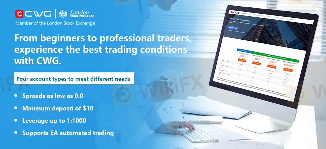 CWG Markets provides four types of accounts: Instant account, Standard account, Advanced account, and Institutional account. All accounts support EA services, with a minimum position size of 0.01. The Instant account requires a minimum deposit of $10 and offers leverage up to 1:1000; the Standard account requires a minimum deposit of $50; both Advanced and Institutional accounts feature spreads as low as 0.0. This extensive range of account types covers the needs of traders from novices to professionals, ensuring that every trader, regardless of strategy or risk preference, can find a suitable account. Seamless trading is guaranteed, no matter where you are, with optimal trading conditions.