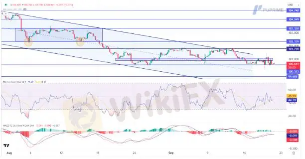 The Dollar Index is trading lower while currently testing the support level. MACD has illustrated diminishing bullish momentum, whale RSI is at 44, suggesting the index might extend its losses after breakout since the RSI stays below the midline.