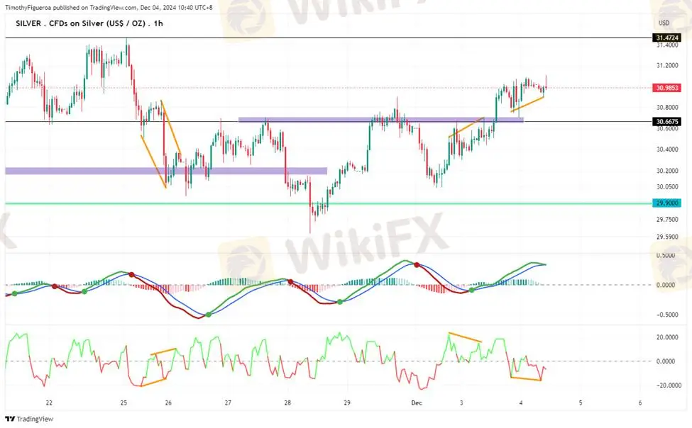 SILVER - Silver surpassed its previous swing high, hinting at a bullish trend. However, consolidation below 31.4724 is still possible, with potential for upward continuation. RSI divergence supports a buying scenario, while the MACD reflects hesitation, indicating a pullback might precede further gains.