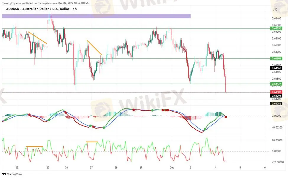 AUDUSD - The Aussie dollar weakened after GDP data fell below expectations, reinforcing selling momentum. The MACD recently crossed downward, and the RSI reflects increased bearish sentiment. Markets predict a 9% chance of a December rate cut, with the likelihood rising to 30% for February.
