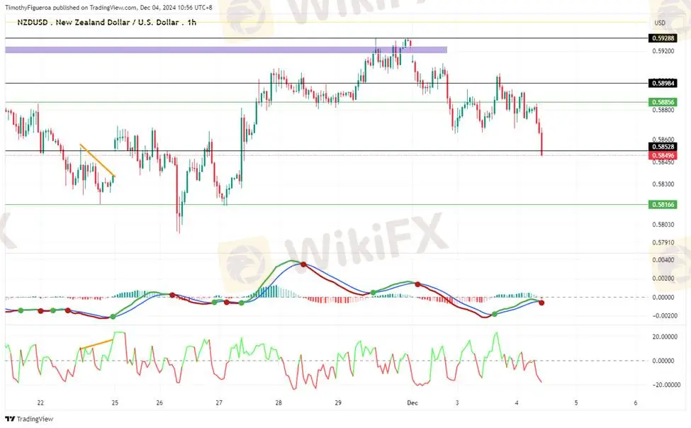 NZDUSD - The Kiwi continues to face selling pressure, confirmed by MACD and RSI momentum. After failing to breach its previous swing high, bearish sentiment dominates. Rate cuts by the Reserve Bank of New Zealand, now at 4.25%, along with geopolitical risks, contribute to its weakness.