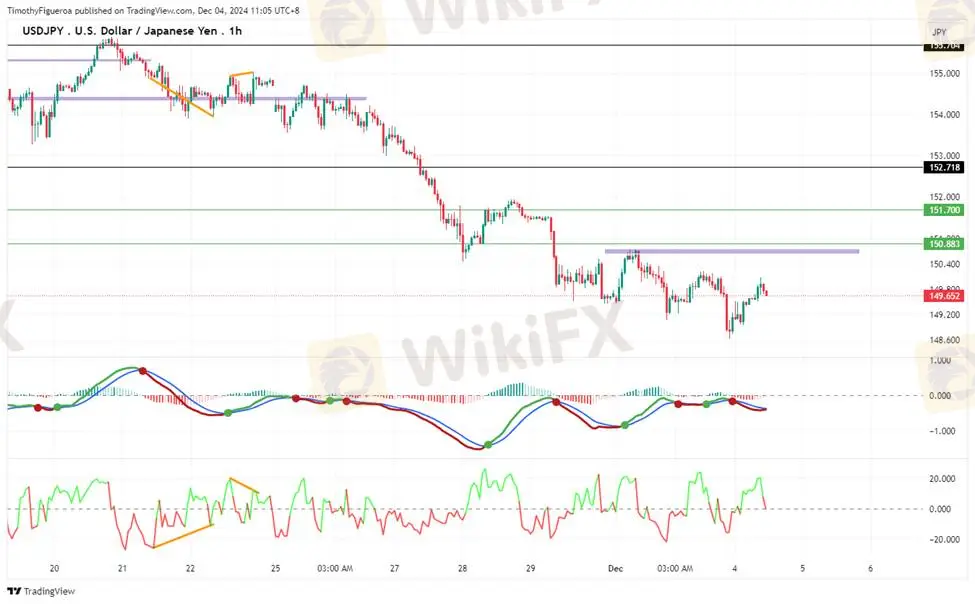 USDJPY - The yen experienced strength as prices dropped, although the dollar recovered, testing its previous swing high. RSI levels near overbought territory hint at potential selling, while the MACD suggests a buying cross unless significant bearish action occurs.