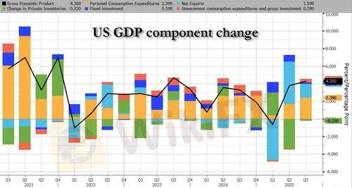 By now, Q3 GDP - which should have been reported almost two months ago - is ancient history but it still matters in a world where the Fed's every sneeze is overanalyzed. Which is why the report by the Bureau of Economic Analysis that in Q3 US GDP surged by 4.3%, up from an already hot 3.8% in Q2 and driven by a spike in consumer spending,will surely raise some eyebrows (for those wondering,