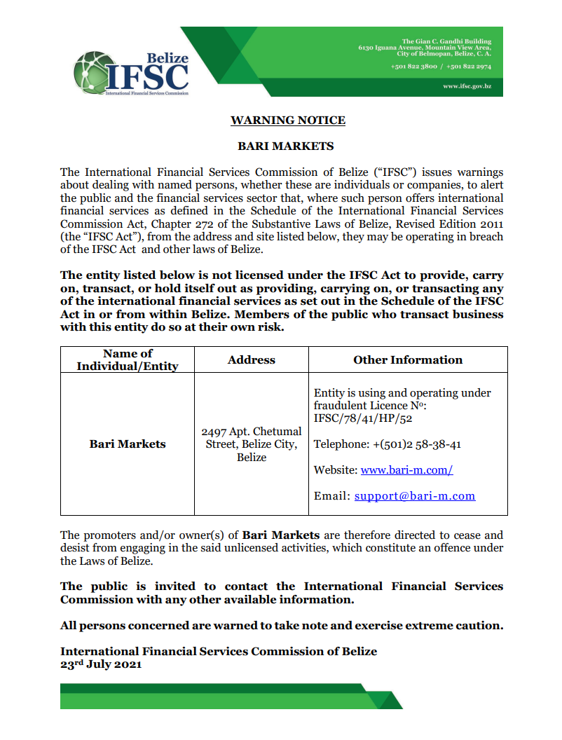 The International Financial Services Commission of Belize (“IFSC”) issues warnings