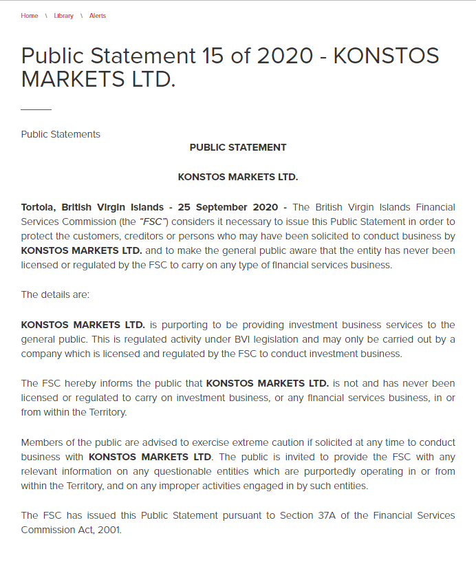 Public Statement 15 of 2020 - KONSTOS MARKETS LTD. Public Statements PUBLIC STATEMENT KONSTOS MARKETS LTD. Tortola, British Virgin Islands - 25 September 2020 - The British Virgin Islands Financial Services Commission (the “FSC”) considers it necessary to issue this Public Statement in order to protect the customers, creditors or persons who may have been solicited to conduct business by KONSTOS MARKETS LTD. and to make the general public aware that the entity has never been licensed or regulated by the FSC to carry on any type of financial services business. The details are: KONSTOS MARKETS LTD. is purporting to be providing investment business services to the general public. This is regulated activity under BVI legislation and may only be carried out by a company which is licensed and regulated by the FSC to conduct investment business. The FSC hereby informs the public that KONSTOS MARKETS LTD. is not and has never been licensed or regulated to carry on investment business, or any financial services business, in or from within the Territory. Members of the public are advised to exercise extreme caution if solicited at any time to conduct business with KONSTOS MARKETS LTD. The public is invited to provide the FSC with any relevant information on any questionable entities which are purportedly operating in or from within the Territory, and on any improper activities engaged in by such entities. The FSC has issued this Public Statement pursuant to Section 37A of the Financial Services Commission Act, 2001.
