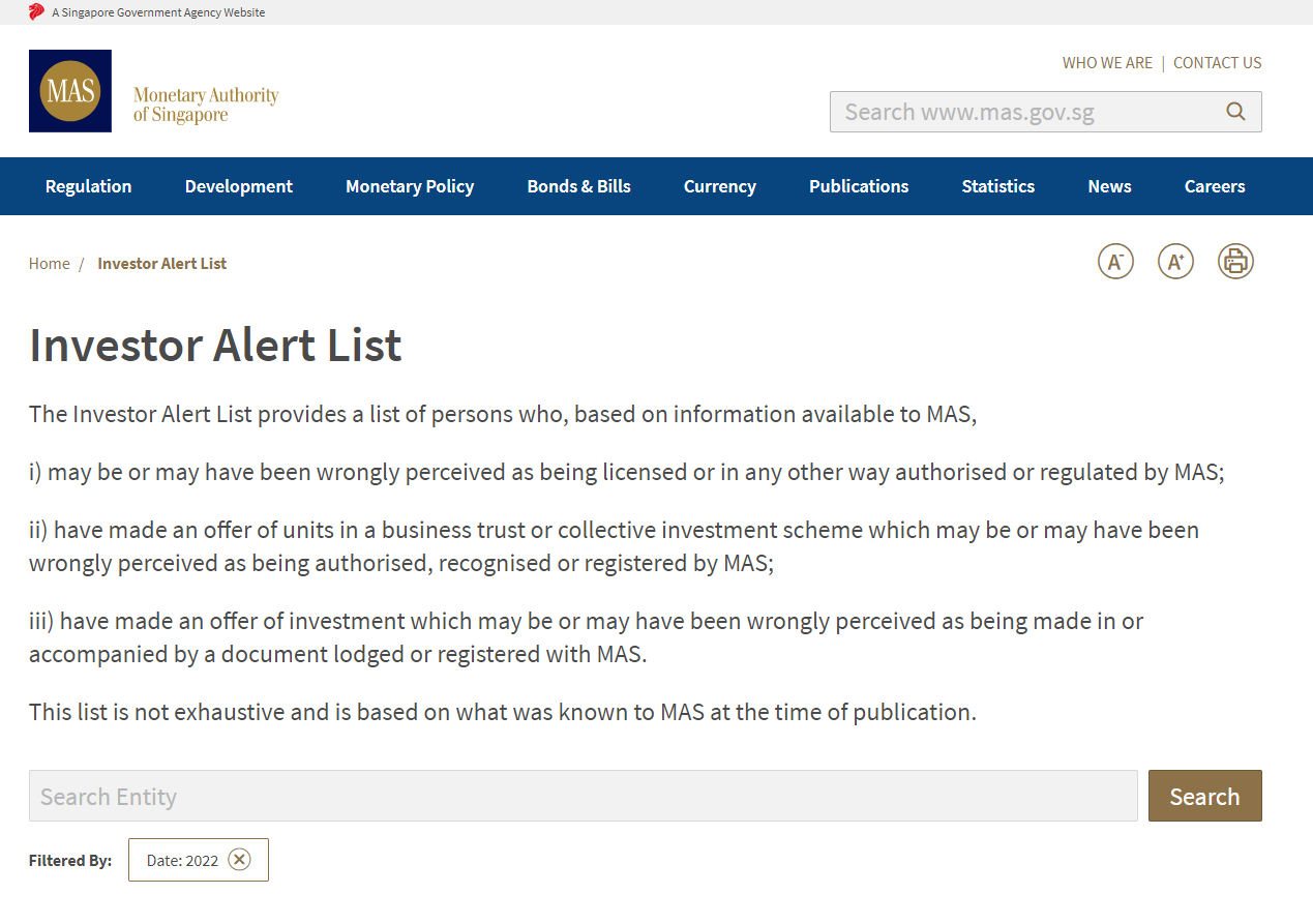 Investor Alert List The Investor Alert List provides a list of persons who, based on information available to MAS, i) may be or may have been wrongly perceived as being licensed or in any other way authorised or regulated by MAS; ii) have made an offer of units in a business trust or collective investment scheme which may be or may have been wrongly perceived as being authorised, recognised or registered by MAS; iii) have made an offer of investment which may be or may have been wrongly perceived as being made in or accompanied by a document lodged or registered with MAS. This list is not exhaustive and is based on what was known to MAS at the time of publication.