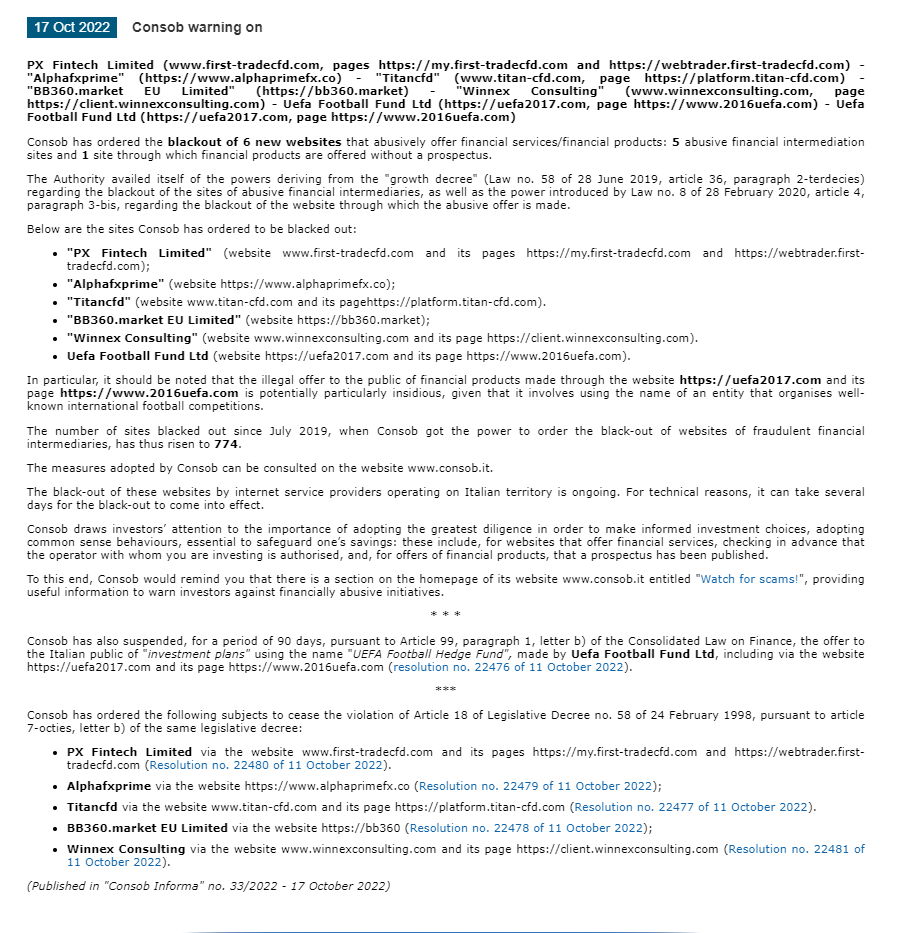 Consob warning on PX Fintech Limited (www.first-tradecfd.com, pages https://my.first-tradecfd.com and https://webtrader.first-tradecfd.com) - "Alphafxprime" (https://www.alphaprimefx.co) - "Titancfd" (www.titan-cfd.com, page https://platform.titan-cfd.com) - "BB360.market EU Limited" (https://bb360.market) - "Winnex Consulting" (www.winnexconsulting.com, page https://client.winnexconsulting.com) - Uefa Football Fund Ltd (https://uefa2017.com, page https://www.2016uefa.com) - Uefa Football Fund Ltd (https://uefa2017.com, page https://www.2016uefa.com)