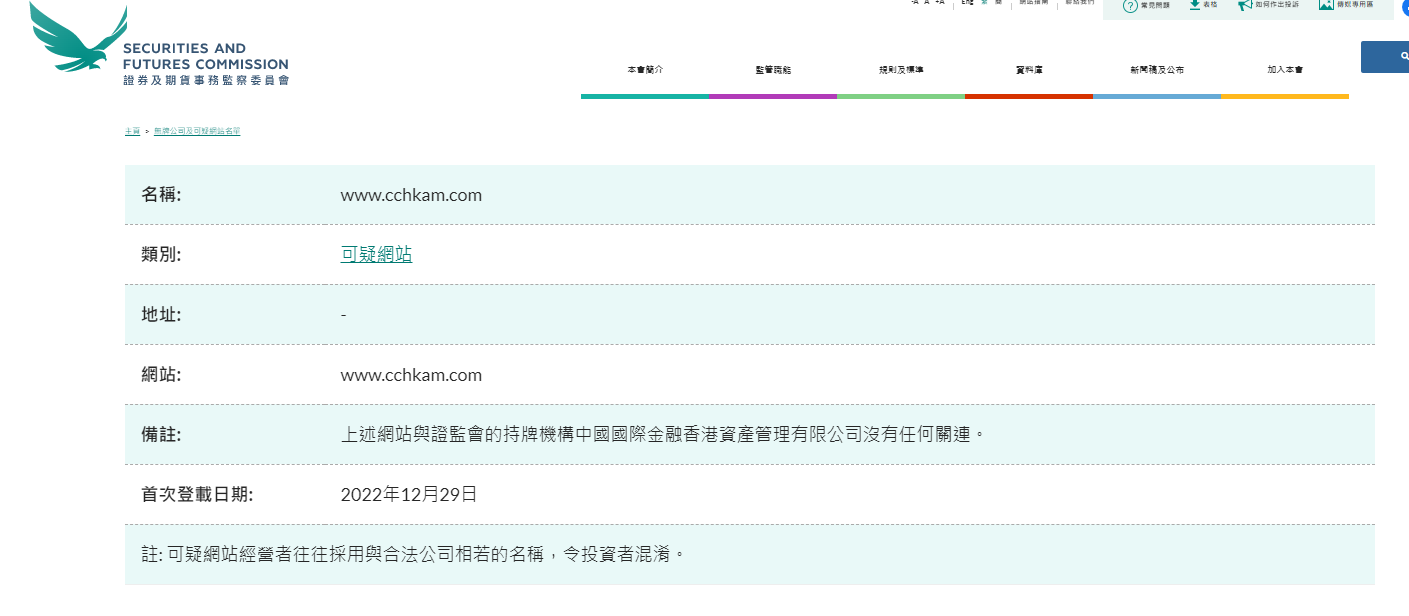 The Unlicensed Companies and Suspicious Websites List lists companies that are not licensed in Hong Kong and that have attracted the attention of the Securities and Futures Commission. These companies are suspected of being or having been marketing to Hong Kong investors, or claiming to have ties to Hong Kong. You can search by name or category to see if a company is on the list. This list is not exhaustive. We add new names to the list from time to time as the SFC often finds companies or websites of note. If you have been approached by an unlicensed company, please use our online complaint form. For further information on boiler rooms, fraudulent websites and phishing emails, please click on the relevant links. Note: The list of unlicensed companies and suspicious websites is intended to alert investors early. Investors should not only rely on the information in the above list, they need to carefully check the details of individual companies on their own. Please select the first English letter of the content name in each column to view the list, or click the "Chinese Name" column to browse companies with only Chinese names. Name: www. CCHKAM .com Category: Suspicious Website Address: - Website: www. CCHKAM .com Remarks: The above websites are not licensed by the SFC CCHKAM Hong Kong Asset Management Co., Ltd. is not connected in any way. Date of first publication: December 29, 2022 Note: Suspicious website operators often use names similar to legitimate companies, confusing investors.