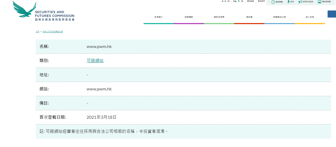 Name: www. PWM .hk Category: Suspicious Website Address: - Website: www. PWM .hk Remarks: - Date of first publication: March 18, 2021 Note: Suspicious website operators often use names similar to legitimate companies, which confuses investors. " The Unlicensed Companies and Suspicious Websites list lists companies that are not licensed in Hong Kong and that have attracted the attention of the SFC. These companies are suspected of being or were marketing to Hong Kong investors, or claiming to have links to Hong Kong. You can search by name or category to see if a company is on the list. This list is not exhaustive. As the SFC often finds companies or websites of note, new ones are added to the list from time to time. If you have been approached by an unlicensed company, please use our online complaint form. For further information on boiler rooms, fraudulent websites and phishing emails, please click on the relevant links. NOTE: The list of unlicensed companies and suspicious websites is intended To issue an early warning to investors. Investors cannot rely solely on the information in the above list, they need to carefully check the details of individual companies. Please select the first English letter of the name of each column to view the list, or click "Chinese name" The column browses companies with Chinese names only."