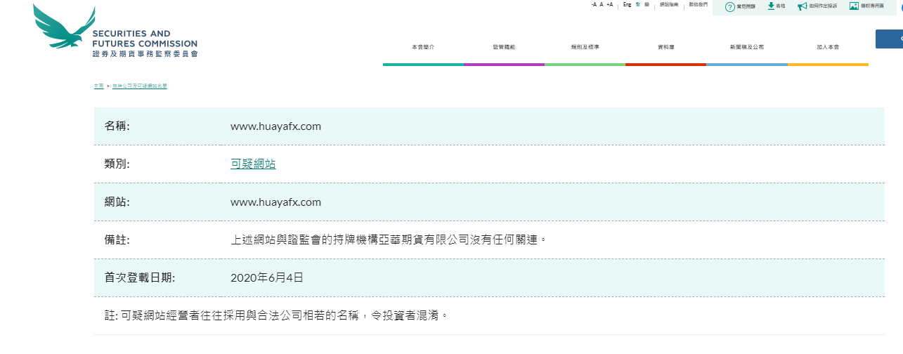 Name: www. huayafx .com Category: Suspicious Website Website: www. huayafx .com Remarks: The above websites are not licensed by the SFC 亞華期貨有限公司 There is no connection. Date of first publication: June 4, 2020 Note: Suspicious website operators often use similar names to legitimate companies, confusing investors. " The Unlicensed Companies and Suspicious Websites list lists companies that are not licensed in Hong Kong and that have attracted the attention of the SFC. These companies are suspected of being or were marketing to Hong Kong investors, or claiming to have links to Hong Kong. You can search by name or category to see if a company is on the list. This list is not exhaustive. As the SFC often finds companies or websites of note, new ones are added to the list from time to time. If you have been approached by an unlicensed company, please use our online complaint form. For further information on boiler rooms, fraudulent websites and phishing emails, please click on the relevant links. NOTE: The list of unlicensed companies and suspicious websites is intended To issue an early warning to investors. Investors cannot rely solely on the information in the above list, they need to carefully check the details of individual companies. Please select the first English letter of the name of each column to view the list, or click "Chinese name" The column browses companies with Chinese names only."
