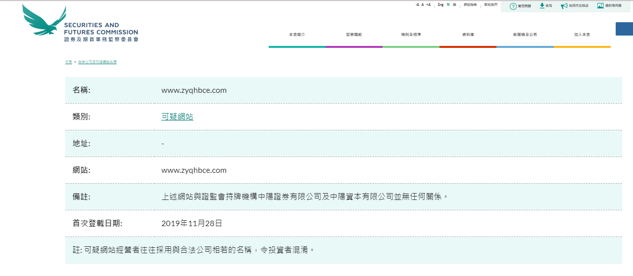 Name: www.zyqhbce.com Category: Suspicious Website Address: - Website: www.zyqhbce.com Remarks: The above website has no relationship with Zhongyang Securities Co., Ltd. and Zhongyang Capital Co., Ltd., which are licensed by the China Securities Regulatory Commission. Date of first publication: November 28, 2019 Note: Suspicious website operators often use similar names to legitimate companies, confusing investors. " The Unlicensed Companies and Suspicious Websites list lists companies that are not licensed in Hong Kong and that have attracted the attention of the SFC. These companies are suspected of being or were marketing to Hong Kong investors, or claiming to have links to Hong Kong. You can search by name or category to see if a company is on the list. This list is not exhaustive. As the SFC often finds companies or websites of note, new ones are added to the list from time to time. If you have been approached by an unlicensed company, please use our online complaint form. For further information on boiler rooms, fraudulent websites and phishing emails, please click on the relevant links. NOTE: The list of unlicensed companies and suspicious websites is intended To issue an early warning to investors. Investors cannot rely solely on the information in the above list, they need to carefully check the details of individual companies. Please select the first English letter of the name of each column to view the list, or click "Chinese name" The column browses companies with Chinese names only."