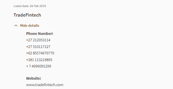 "Investor Alert List The Investor Alert List provides a list of persons who, based on information available to MAS, i) may be or may have been wrongly perceived as being licensed or in any other way authorised or regulated by MAS; ii) have made an offer of units in a business trust or collective investment scheme which may be or may have been wrongly perceived as being authorised, recognised or registered by MAS; iii) have made an offer of investment which may be or may have been wrongly perceived as being made in or accompanied by a document lodged or registered with MAS. This list is not exhaustive and is based on what was known to MAS at the time of publication." Listed date: 26 Feb 2019 TradeFintech Hide details Phone Number: +27 212053114 +27 510117127 +62 85574670770 +381 113216895 + 7 4996091299 Website: www.tradefintech.com