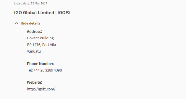 "Investor Alert List The Investor Alert List provides a list of persons who, based on information available to MAS, i) may be or may have been wrongly perceived as being licensed or in any other way authorised or regulated by MAS; ii) have made an offer of units in a business trust or collective investment scheme which may be or may have been wrongly perceived as being authorised, recognised or registered by MAS; iii) have made an offer of investment which may be or may have been wrongly perceived as being made in or accompanied by a document lodged or registered with MAS. This list is not exhaustive and is based on what was known to MAS at the time of publication." Listed date: 23 Mar 2017 IGO Global Limited ; IGOFX Hide details Address: Govant Building BP 1276, Port Vila Vanuatu Phone Number: Tel: +44 20 3289 4398 Website: http://igofx.com/