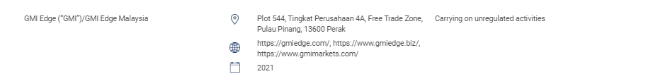 "This section contains the list of unauthorised websites, investment products, companies and individuals. This list includes: Persons carrying on or hold himself out as carrying on the following regulated activities without a licence from the SC: Dealing in securities; Dealing in derivatives;Fund management; Advising on corporate finance; Investment advice; Financial planning; and Dealing in private retirement schemes. Persons operating a recognised market without authorisation. Persons issuing or offering securities without approval, authorisation or recognition. Persons misusing SC’s logo and misrepresenting the SC. " GMI Edge (“GMI”)/GMI Edge Malaysia Plot 544, Tingkat Perusahaan 4A, Free Trade Zone, Pulau Pinang, 13600 Perak https://gmiedge.com/, https://www.gmiedge.biz/, https://www.gmimarkets.com/ 2021 Carrying on unregulated activities