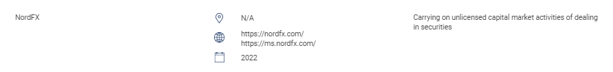 "This section contains the list of unauthorised websites, investment products, companies and individuals. This list includes: Persons carrying on or hold himself out as carrying on the following regulated activities without a licence from the SC: Dealing in securities; Dealing in derivatives;Fund management; Advising on corporate finance; Investment advice; Financial planning; and Dealing in private retirement schemes. Persons operating a recognised market without authorisation. Persons issuing or offering securities without approval, authorisation or recognition. Persons misusing SC’s logo and misrepresenting the SC. " NordFX N/A https://nordfx.com/ https://ms.nordfx.com/ 2022 Carrying on unlicensed capital market activities of dealing in securities