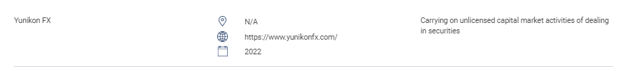 "This section contains the list of unauthorised websites, investment products, companies and individuals. This list includes: Persons carrying on or hold himself out as carrying on the following regulated activities without a licence from the SC: Dealing in securities; Dealing in derivatives;Fund management; Advising on corporate finance; Investment advice; Financial planning; and Dealing in private retirement schemes. Persons operating a recognised market without authorisation. Persons issuing or offering securities without approval, authorisation or recognition. Persons misusing SC’s logo and misrepresenting the SC. " Yunikon FX N/A https://www.yunikonfx.com/ 2022 Carrying on unlicensed capital market activities of dealing in securities