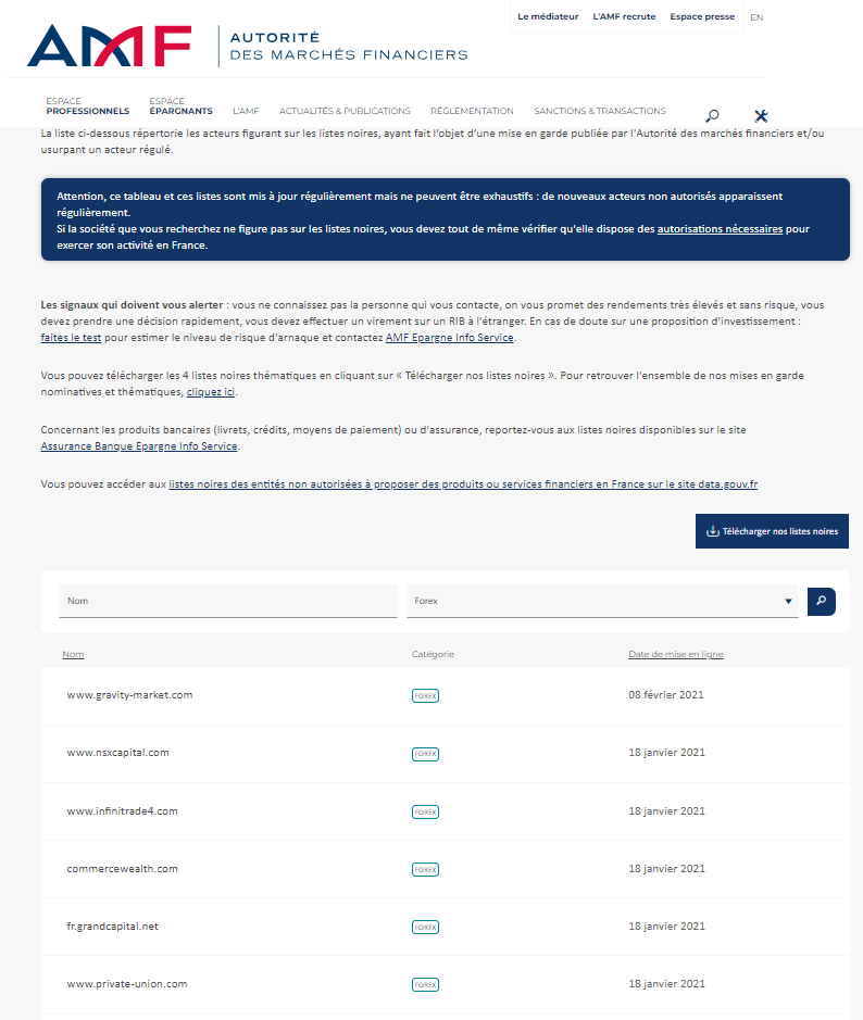 This is a list of the Autorité des Marchés Financiers (AMF) blacklisted companies or websites, warnings and/or usurpations of regulated companies.